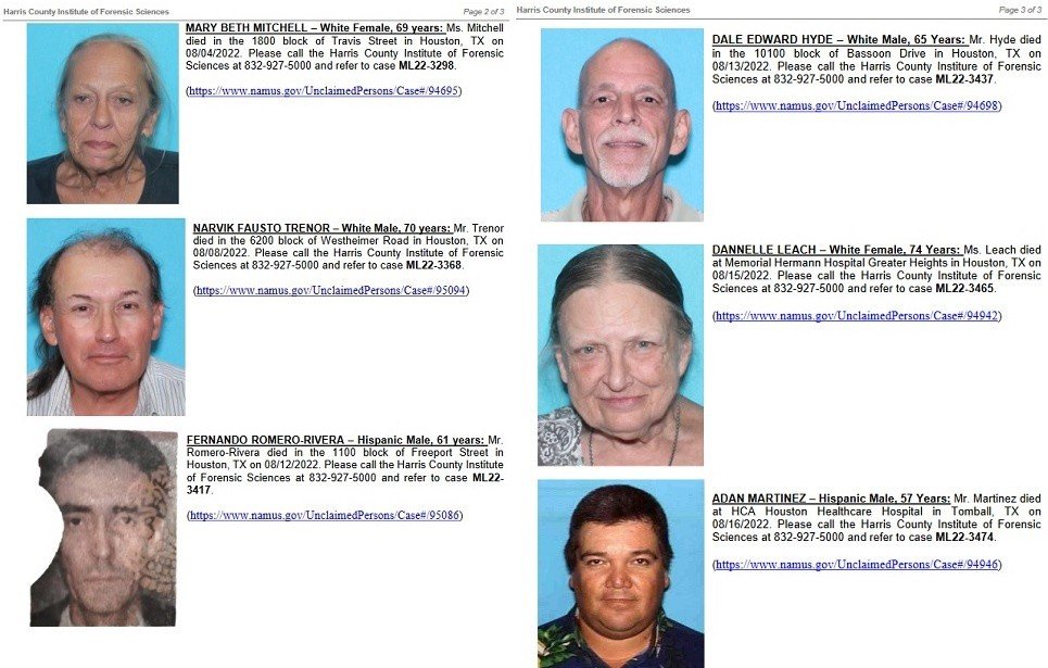 Harris County Institute of Forensic Sciences is requesting the public’s assistance in locating next of kin for the following deceased individuals.